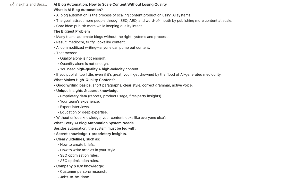 Instead of fighting with individual tools, you build an entire system that connects your knowledge base, research process, content brief creation, and writing workflow into one automated pipeline.